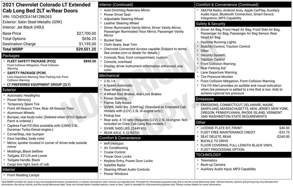 Recent Arrival! 4-Wheel Disc Brakes, 4.10 Rear Axle Ratio, 6 Speakers, 6-Speaker Audio System Feature, ABS brakes, Air Conditioning, Alloy wheels, AM/FM radio: SiriusXM, Apple CarPlay/Android Auto, Auto-dimming Rear-View mirror, Bumpers: body-color, Cloth Seat Trim, Compass, Delay-off headlights, Driver 6-Way Power Seat Adjuster, Driver door bin, Driver vanity mirror, Dual front impact airbags, Dual front side impact airbags, Electronic Stability Control, Enhanced Driver Instrument Information Display, Exterior Parking Camera Rear, Forward Collision Alert, Front anti-roll bar, Front Bucket Seats, Front Center Armrest, Front License Plate Kit, Front reading lights, Front wheel independent suspension, Fully automatic headlights, Illuminated entry, Lane Departure Warning System, Low tire pressure warning, Occupant sensing airbag, Outside temperature display, Overhead airbag, Overhead console, Panic alarm, Passenger door bin, Passenger vanity mirror, Power door mirrors, Power driver seat, Power steering, Power windows, Preferred Equipment Group 2LT, Premium audio system: Chevrolet Infotainment 3, Radio data system, Radio: Chevrolet Infotainment 3 System, Rear step bumper, Rear Vision Camera, Remote keyless entry, Safety Package, Security system, SiriusXM Radio, Speed control, Speed-sensing steering, Split folding rear seat, Steering wheel mounted audio controls, Tachometer, Telescoping steering wheel, Tilt steering wheel, Traction control, Trip computer, UltraSonic Rear Park Assist, Variably intermittent wipers, Wheels: 17" x 8" Blade Silver Metallic Cast Alloy.